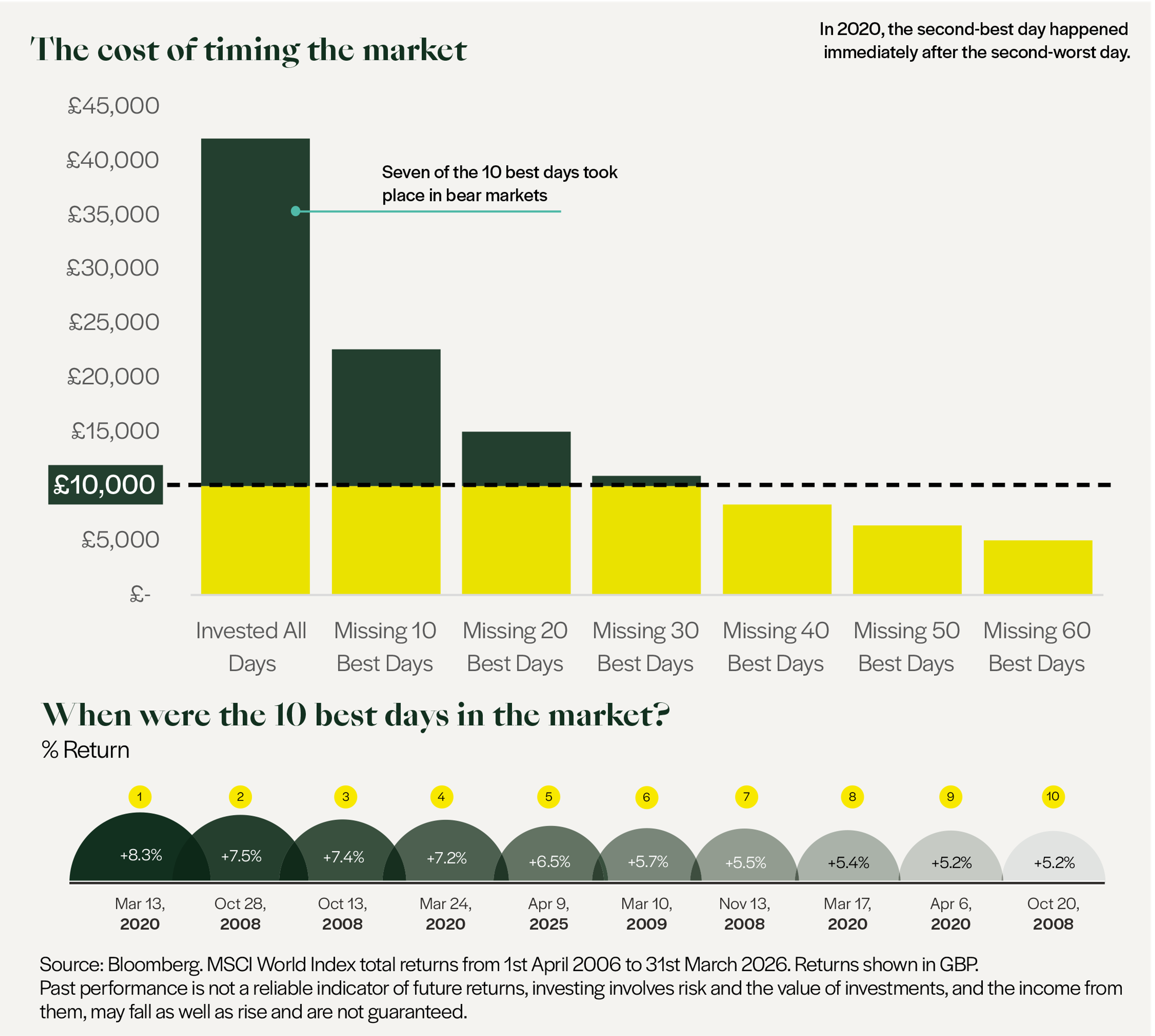 The chart below shows the huge potential impact on your overall returns if you were to miss the best days for stock market performance. It suggests that missing 60 of the best market days would leave your investment returns a staggering 88% lower over 20 years.